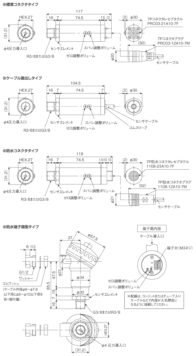 [4~20mA(2線式、4線式),1~5V,0~5V,0~10V]ケーブル接続部は、「直出し」「標準コネクタ」「防水コネクタ」「端子箱」の各種をご用意