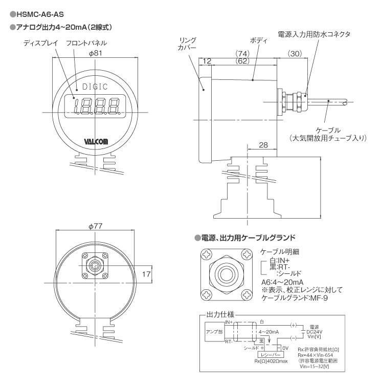 | A6 | 4~20mA(2線式) ※電源4(DC24V)のみ適応 | 500Hz | RX≦44×Vin-654 RX: 許容負荷抵抗 [Ω] Vin: 電源電圧 [V] | ||