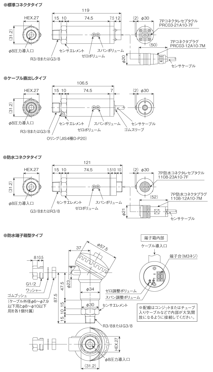 | ケーブル | 4芯または2芯シールド(耐油) ケーブル2m標準 φ6mm 防水コネクタ?ケーブル直出しタイプのゲージ圧はチューブ入りケーブル使用 |