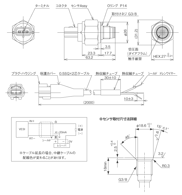 | 1.基本型式 | ○ | VES | フラッシュタイプ中高圧用小型アンプ內蔵圧力センサ ※接続ネジ:G3/8 | |||