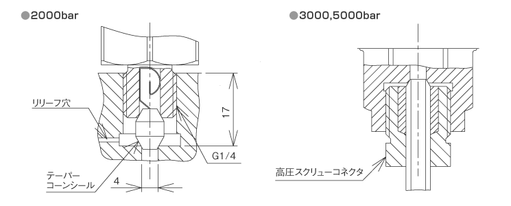 | 圧力導入部 | 2000bar:G1/4雄ネジ 3000,5000bar:M16×1.5雌ネジ | |