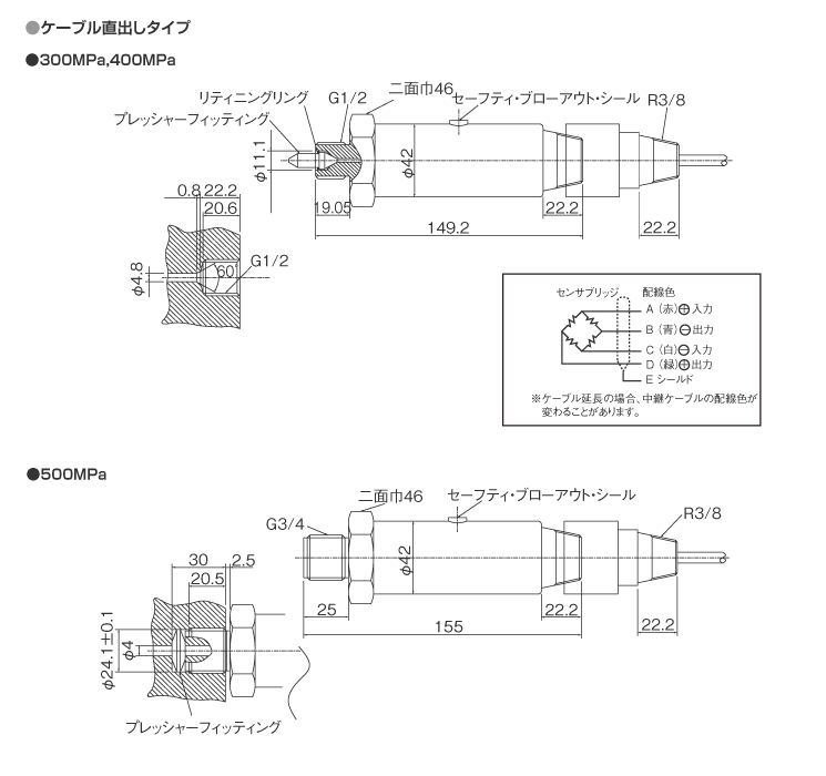 1.基本型式VPRS超高圧高精度用圧力センサ ※接続ネジ:G1/2(500MPa:G3/4)