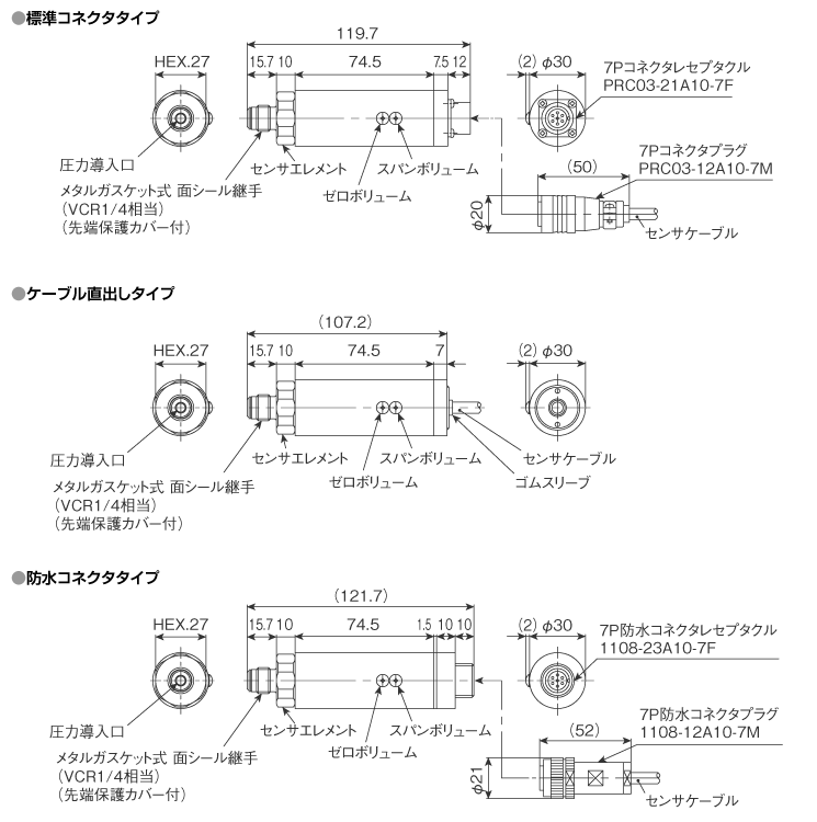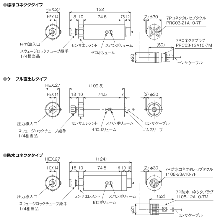 | ケーブル | 4芯または2芯シールド(耐油)ケーブル 2m標準 φ6mm 防水コネクタ?ケーブル直出しタイプのゲージ圧仕様はチューブ入りケーブル使用 |
