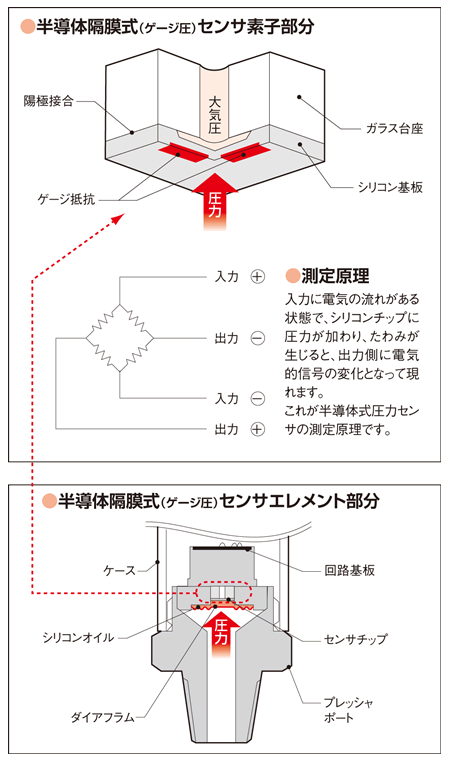 半導體式のシリコンチップは金屬式のチップに比べ、厚いダイアフラムでの製作が可能となり、圧力センサの耐圧性が向上しています。また、センサエレメントでの供給の場合、ハステロイC-22相當やSUS316Lなどの耐腐食性の高い金屬ダイアフラムを介して圧力を受ける二重ダイアフラム方式が採用されています。