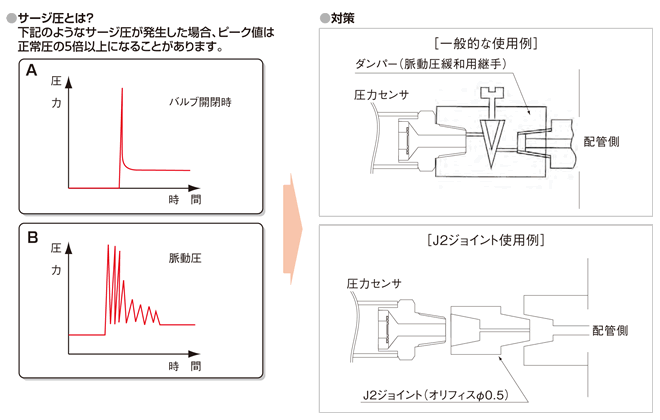 サージ圧が圧力センサの許容耐圧を超えるとセンサの故障に至ります。