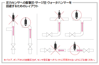 使用布局閥等使流量急劇變化的話,產生激烈的過渡性的壓力變動,發生象打東西一樣的聲音。這個叫做水錘(水擊現象)。水錘(水擊現象)發生時,傳感器受壓部位會產生過大壓力,造成故障,請注意。