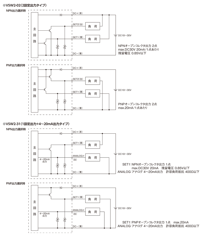 | NPN/PNP 切替機能 | 設定出力をNPN出力にするかPNP出力にするかを選択できます(出力02Nは対応不可) |