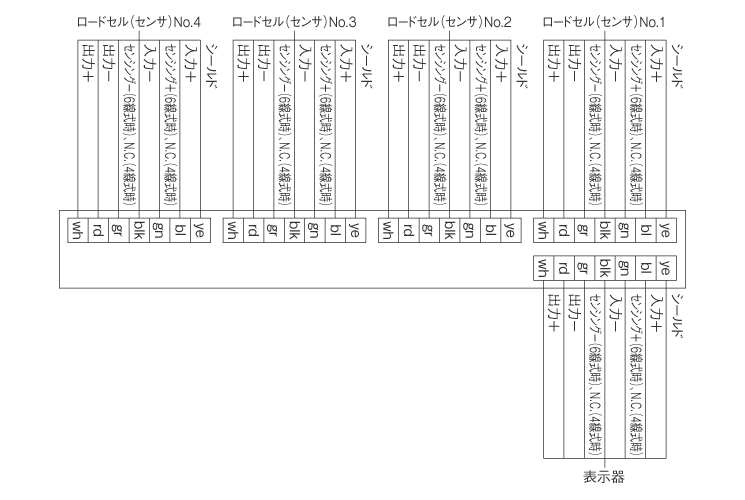 • ※ロードセル側:4線式、表示器側6線式の場合またはロードセル側:6線式、表示器側4線式の場合はジャンクションボックス內部表示器側の端子臺にてセンシング+と入力+、センシング-と入力-をショートさせてください。