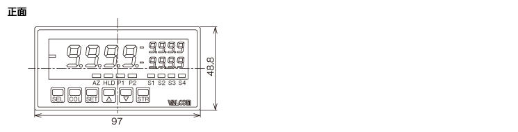 その他の機能表示スケーリング、アナログ出力スケーリング、表示ホールド(アッパーピーク/ボトムピーク/區間ピーク/ピークtoピーク/サンプルホールド)、オートゼロ、最大値/最小値表示、パターンセレクト、シミュレーション機能、入力値シフト 副表示ON/OFF、キープロテクト、主表示色可変表示、表示更新周期設定、省電力モードON/OFF、サンプリング速度設定、ダンピング時定數、ゼロサプレスON/OFF、FIXゼロ