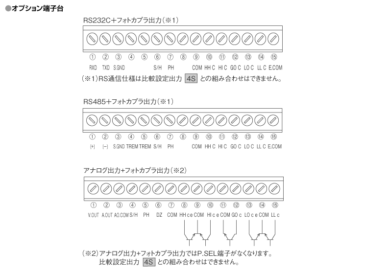 | 4S | 4點(HH/H/G/L/LL) | リレー信號×5 AC125V 0.3A(抵抗負荷) DC30V 1A(抵抗負荷) | ※アナログ出力、RS-232C出力、 RS-485出力付の選択は不可 | ||
