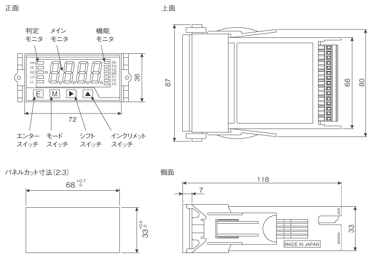 外形寸法72mm(W)×36mm(H)×118mm(D)
