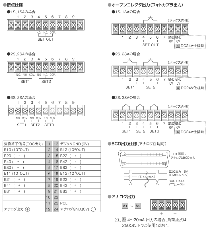 | 3.BCD出力 ※アナログ出力と BCD出力は併用可能 | - | - | 出力種類 | 応答周波數 | 許容負荷 | |