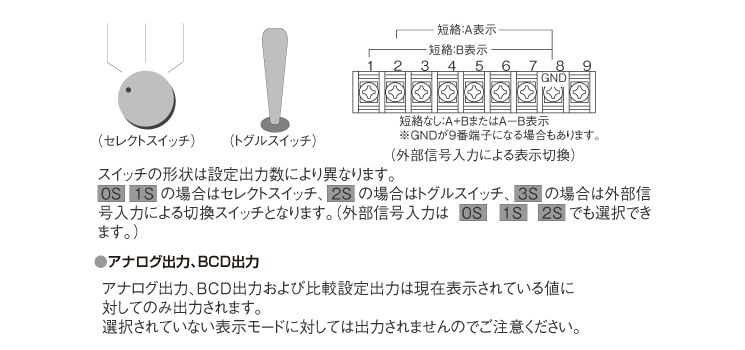 | D | 表示のみ(出力なし)Dをご選択の場合、アナログ出力?BCD出力は選択できません | |||||